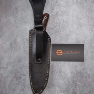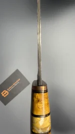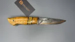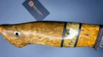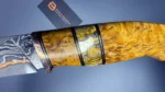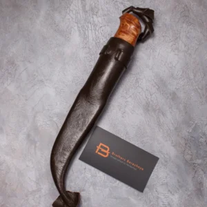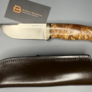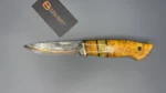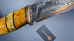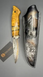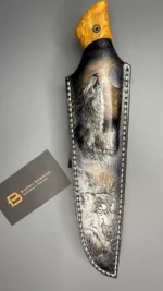 The blade is made using the ‘sandwich’ principle, the central part is 9HF steel, with laminate layers of Damascus steel featuring nickel, copper, and SHH15. For the handle, materials such as stabilized Karelian birch, mokume gana, stabilized mammoth tooth, and a mosaic pin were used. The sheath is made from high-quality natural vegetable-tanned leather, featuring hand-crafted artistic engraving in the Angry Wolf style.