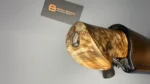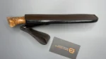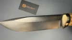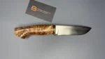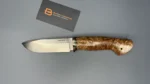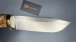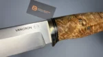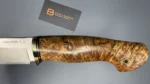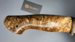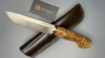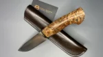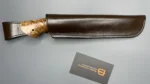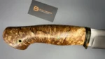 The knife is made with Uddeholm Vancron® SuperClean steel for the blade, the handle is made of Karelian birch, the tang construction is through the handle, the bolster is made of nickel silver, and the sheath is made of natural leather