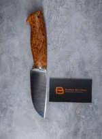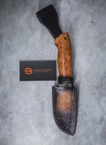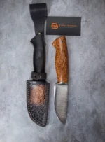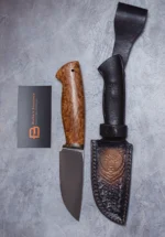 This knife embodies the perfect balance of strength and aesthetics. The blade is crafted from high-quality S390 steel, providing excellent sharpness and durability. The handle is made of Karelian birch, giving the knife a natural and elegant appearance. The guard is made of nickel silver and is precision-milled for added strength and a unique design. The lanyard hole is crafted from stainless steel tubing, ensuring reliability and long-lasting use. The sheath is made of vegetable-tanned leather and hand-painted, adding individuality and refinement to the piece. This knife will be a reliable companion in any situation!