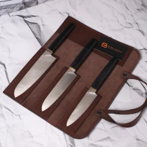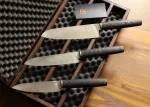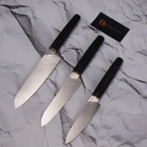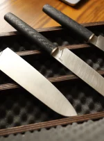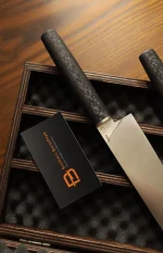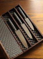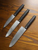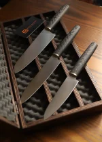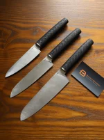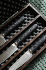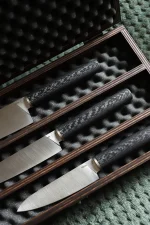 A refined three-piece set made from Vanax stainless powder steel (hardness 60 HRC) with carbon fiber handles. Exceptional corrosion resistance, long-lasting sharpness, and balanced handling. Delivered in an elegant gift box with individual compartments and protective foam.
