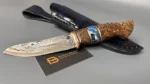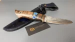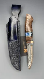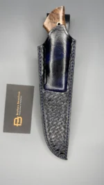 The blade is made using the ‘sandwich’ principle, the central part is 9HF steel, with laminate layers of Damascus steel featuring nickel, copper, and SHH15. For the handle, materials such as stabilized Karelian birch, mokume gana, stabilized mammoth tooth, and a mosaic pin were used. The sheath is made from high-quality natural vegetable-tanned leather and dyed in black and blue.